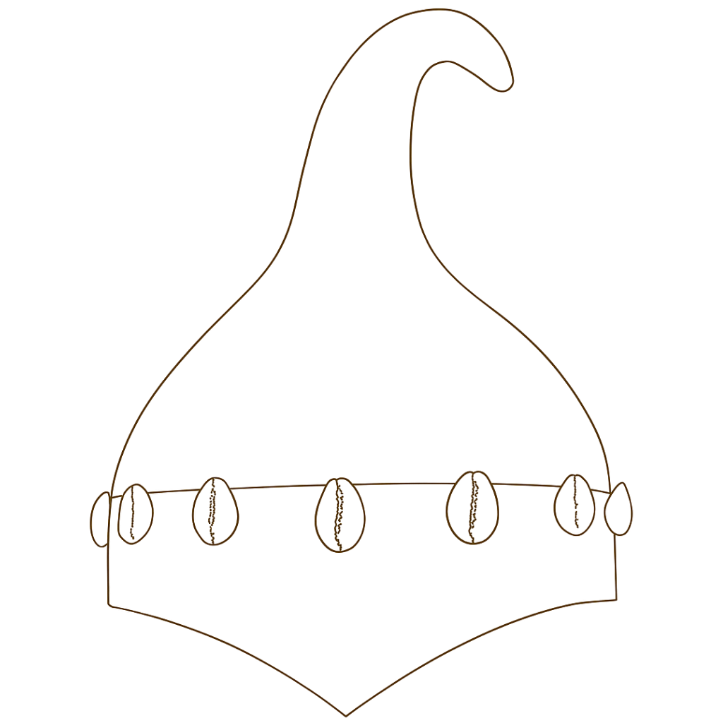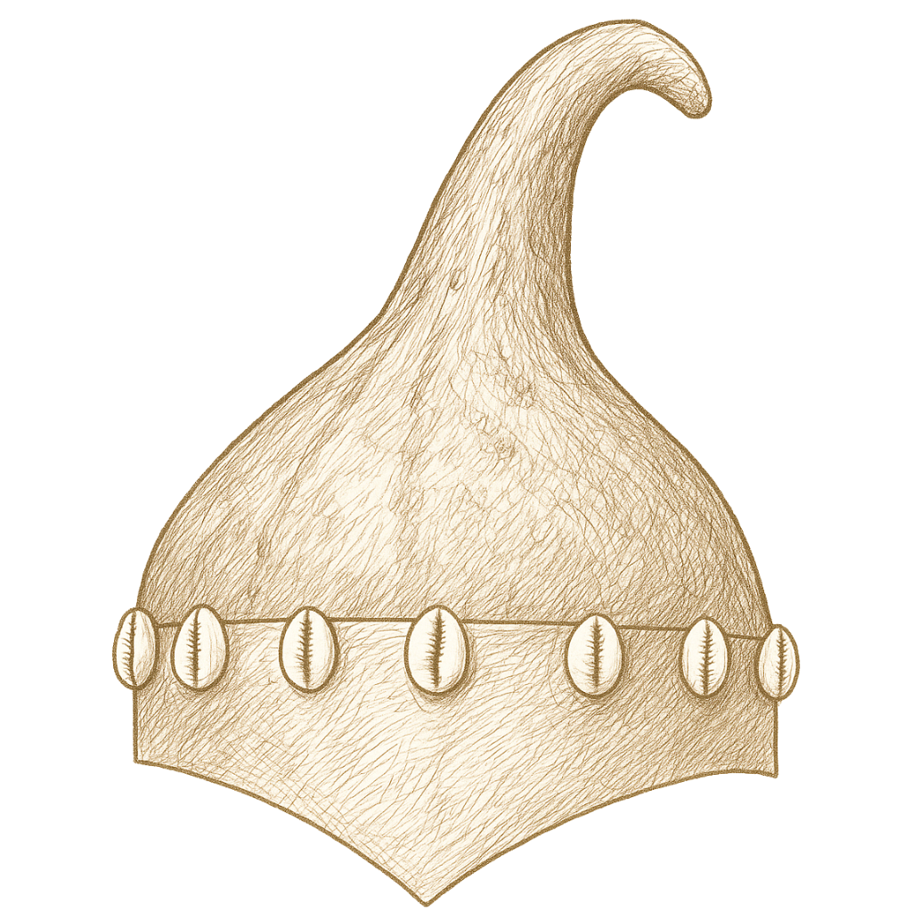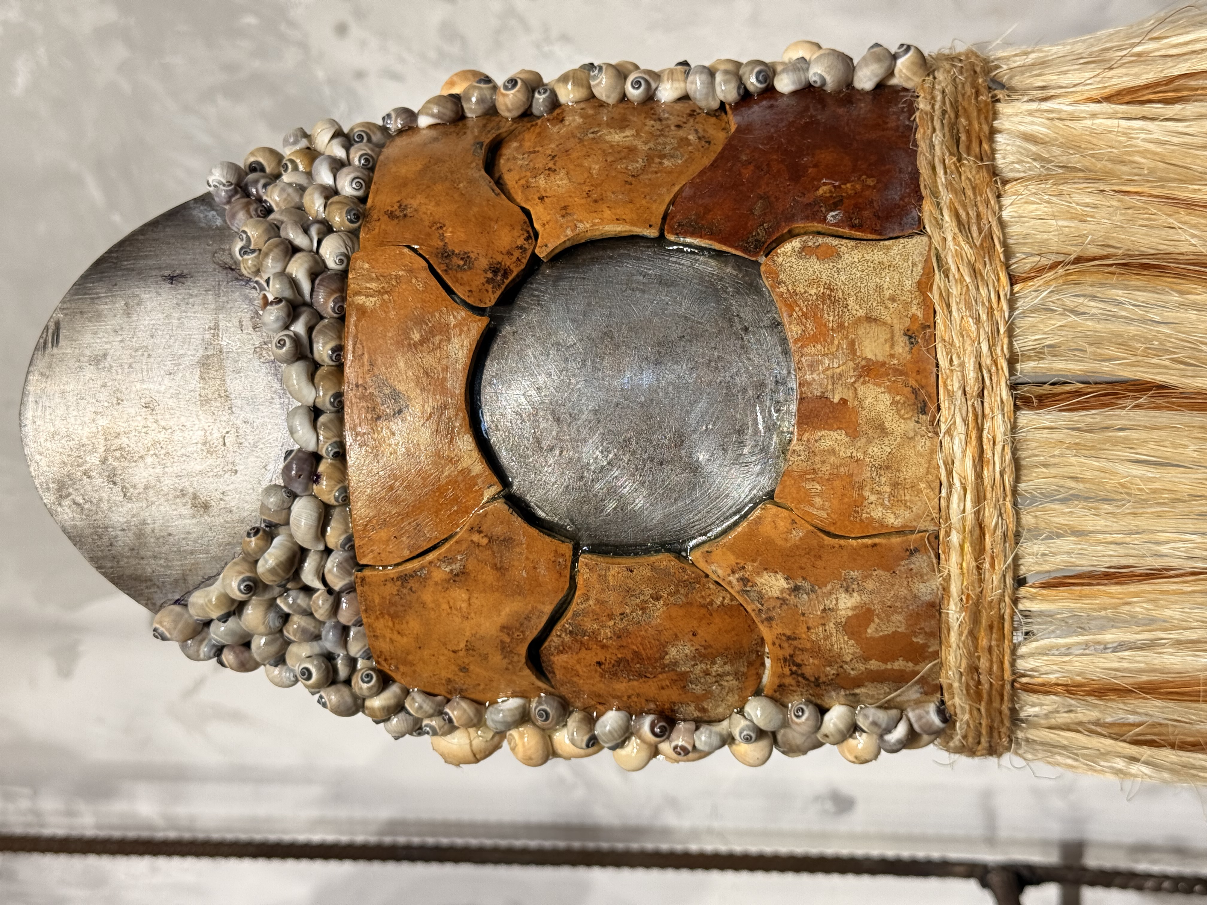 O Adê de Oxalufã foi pensado para ser múltiplo e disciplinado. O círculo central representa a Terra, partitura da criação. Fragmentos de cabaça foram curados, cepados e encaixados como mosaico controlado, evocando a embriaguez de Oxalá (queda, perda da missão, recomposição). As conchas — de duas espécies — foram distribuídas por leitura de brilho, curvatura e volume para não competir com o Ofun.
