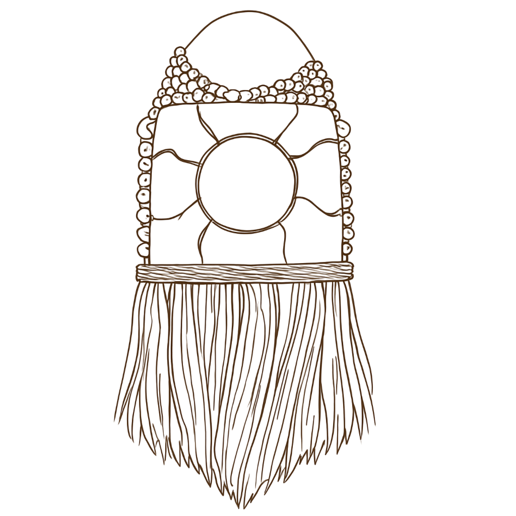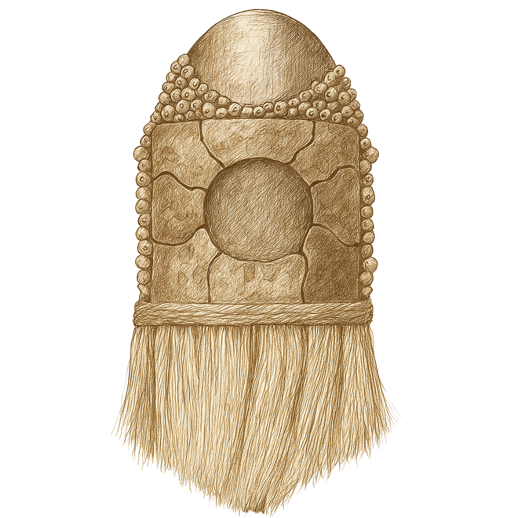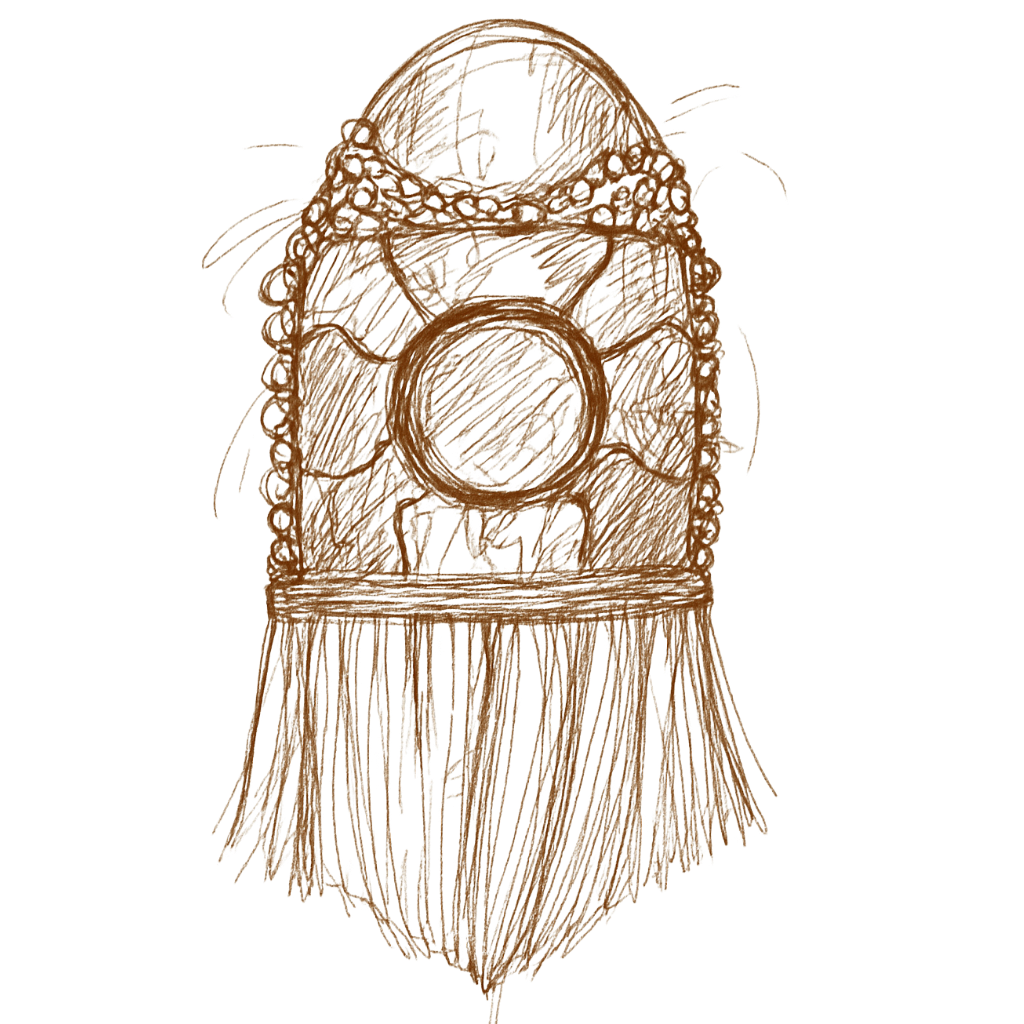O Adê de Oxalufã foi pensado para ser múltiplo e disciplinado. O círculo central representa a Terra, partitura da criação. Fragmentos de cabaça foram curados, cepados e encaixados como mosaico controlado, evocando a embriaguez de Oxalá (queda, perda da missão, recomposição). As conchas — de duas espécies — foram distribuídas por leitura de brilho, curvatura e volume para não competir com o Ofun.