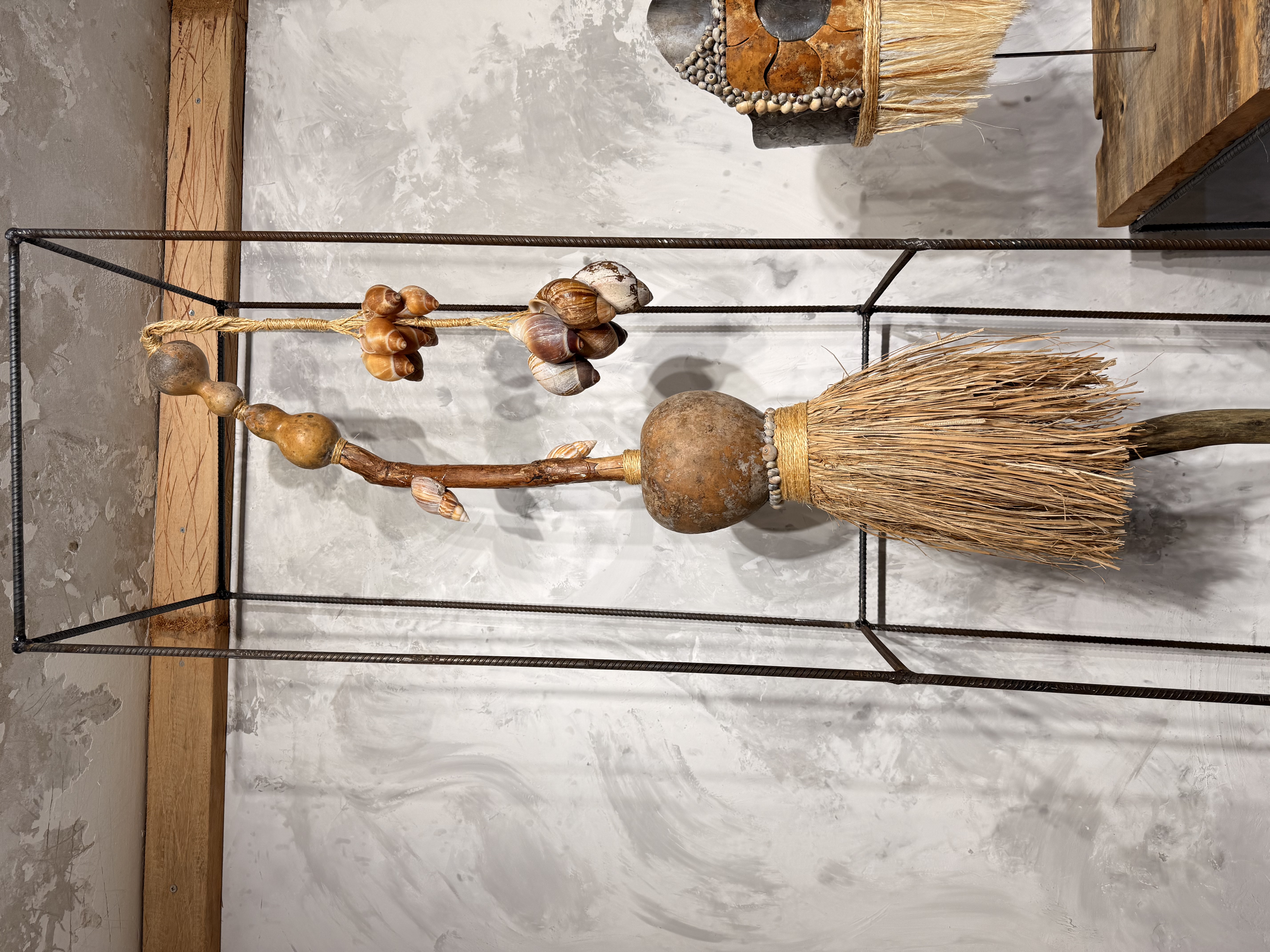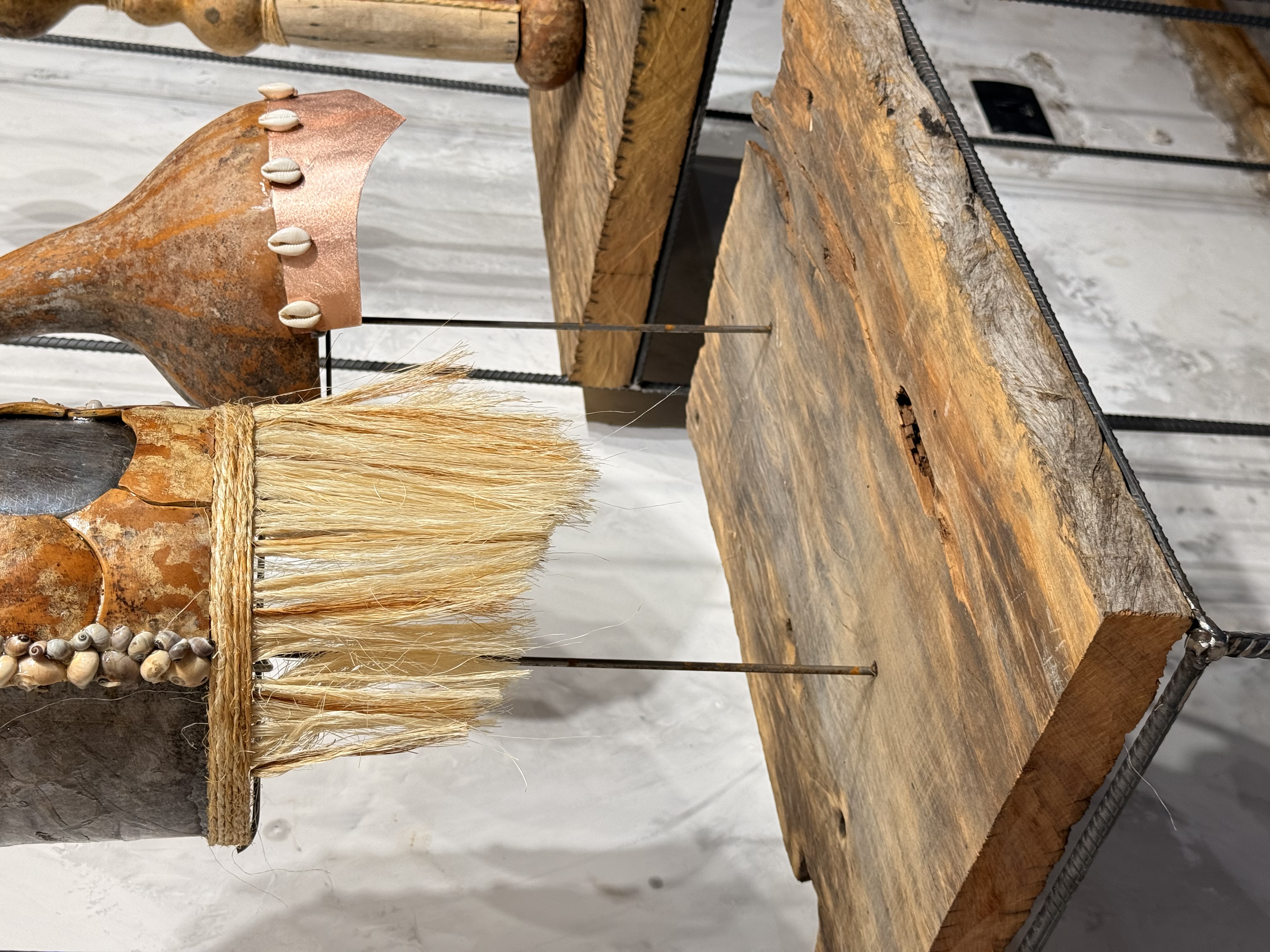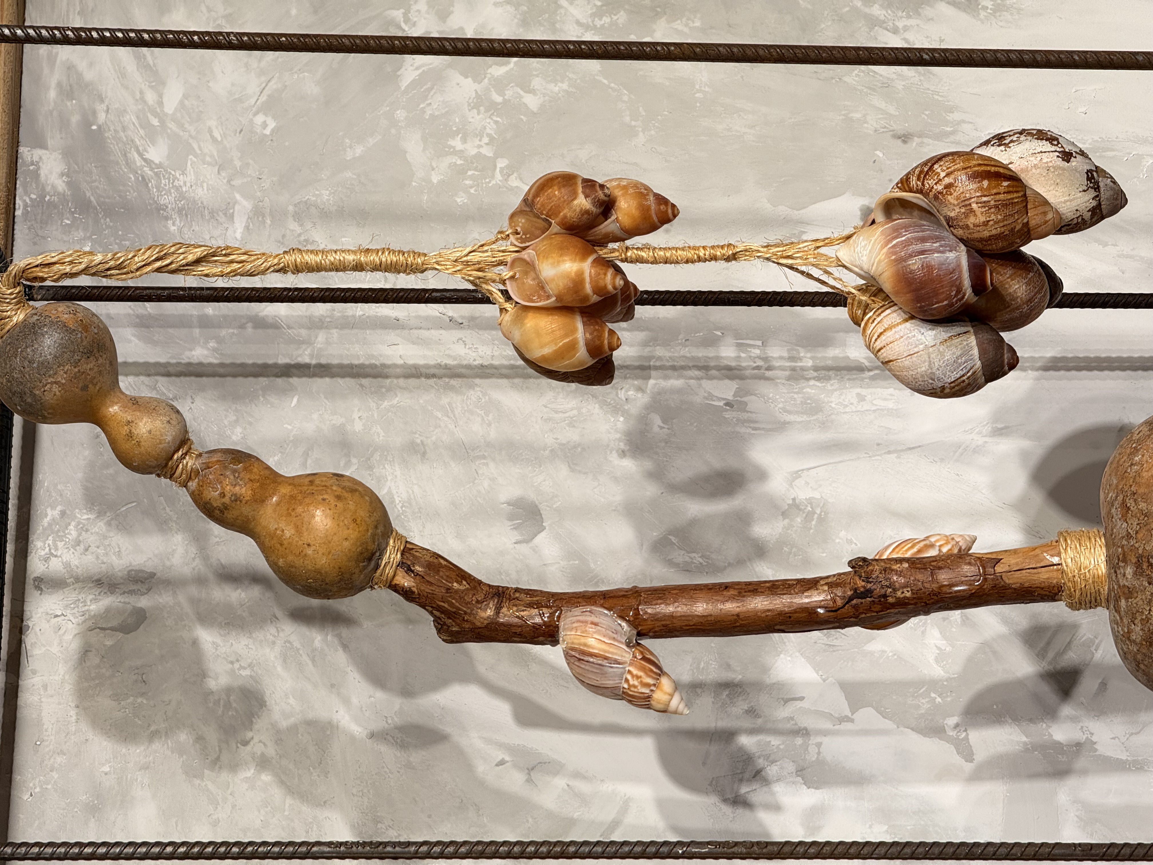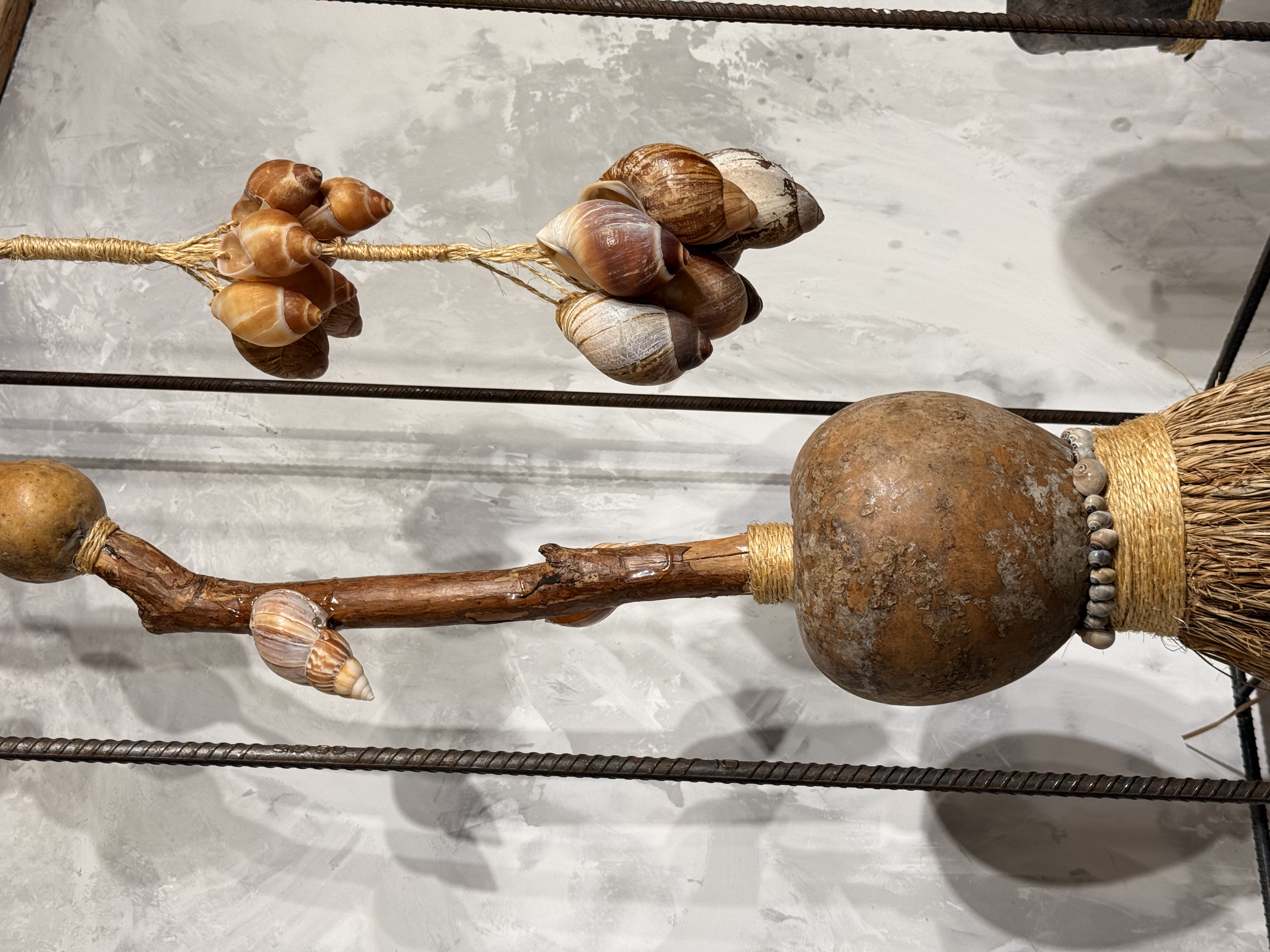 Da união dos dois, vem a matéria: cabaça, cobre, búzio, sisal cru e madeira nobre. Não são enfeites; são sentido. A instalação foi pensada em eixo: os Adês, no centro, falam como duas vozes que se olham; o Opaxorô (esq.) e o Ogó (dir.) erguem o corpo da obra. A cabaça aparece em base, forma, fragmento e encaixe — contando, por etapas, a mesma história.