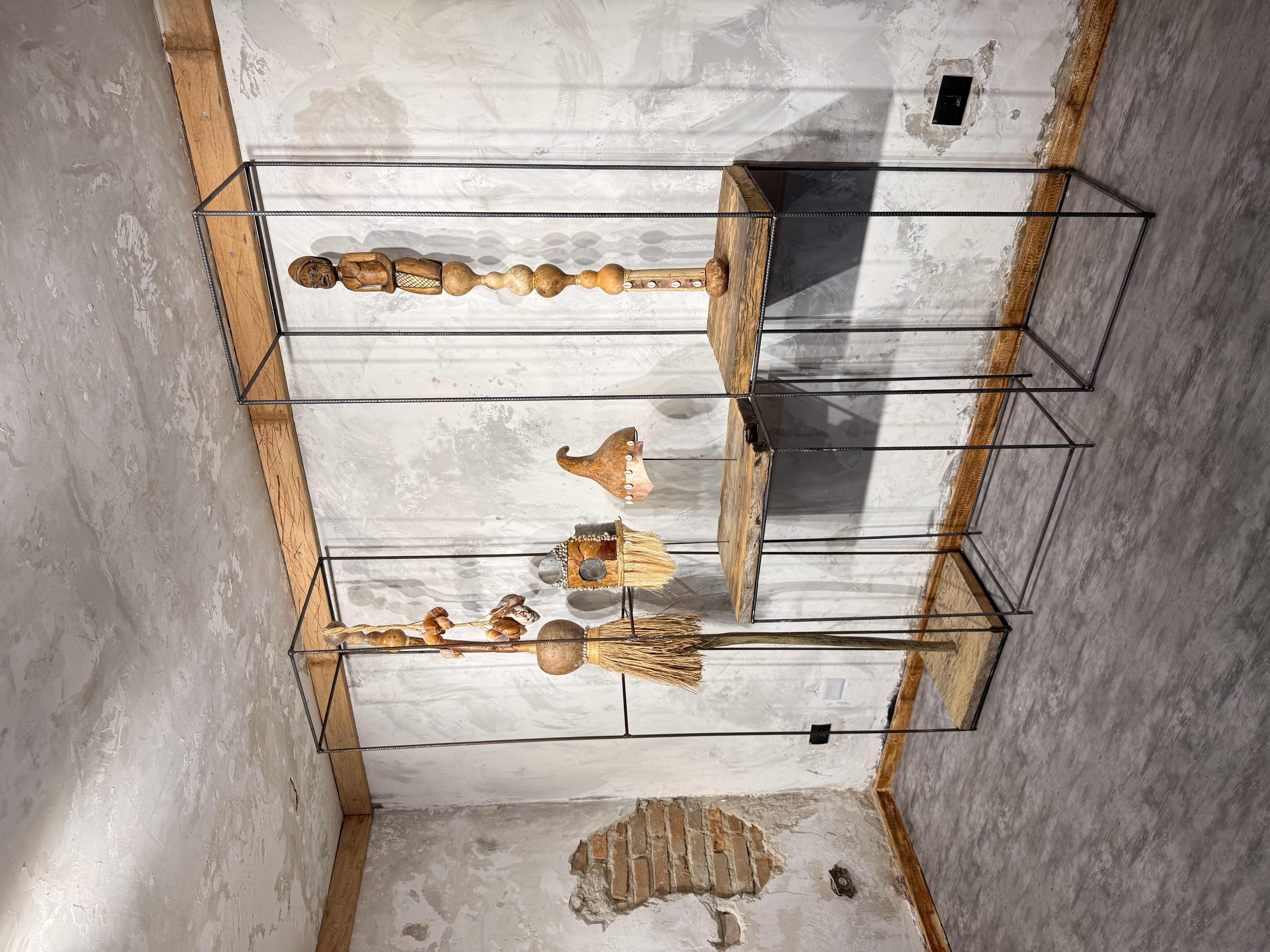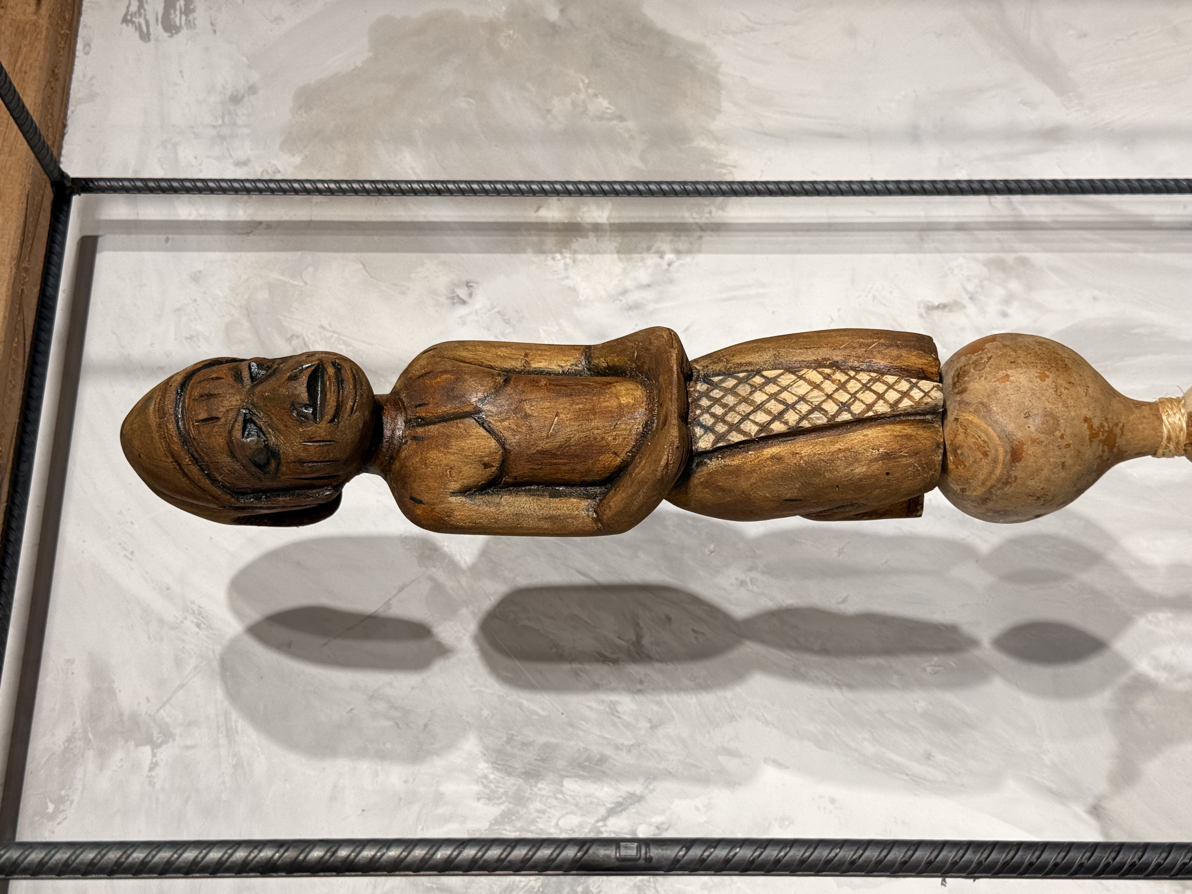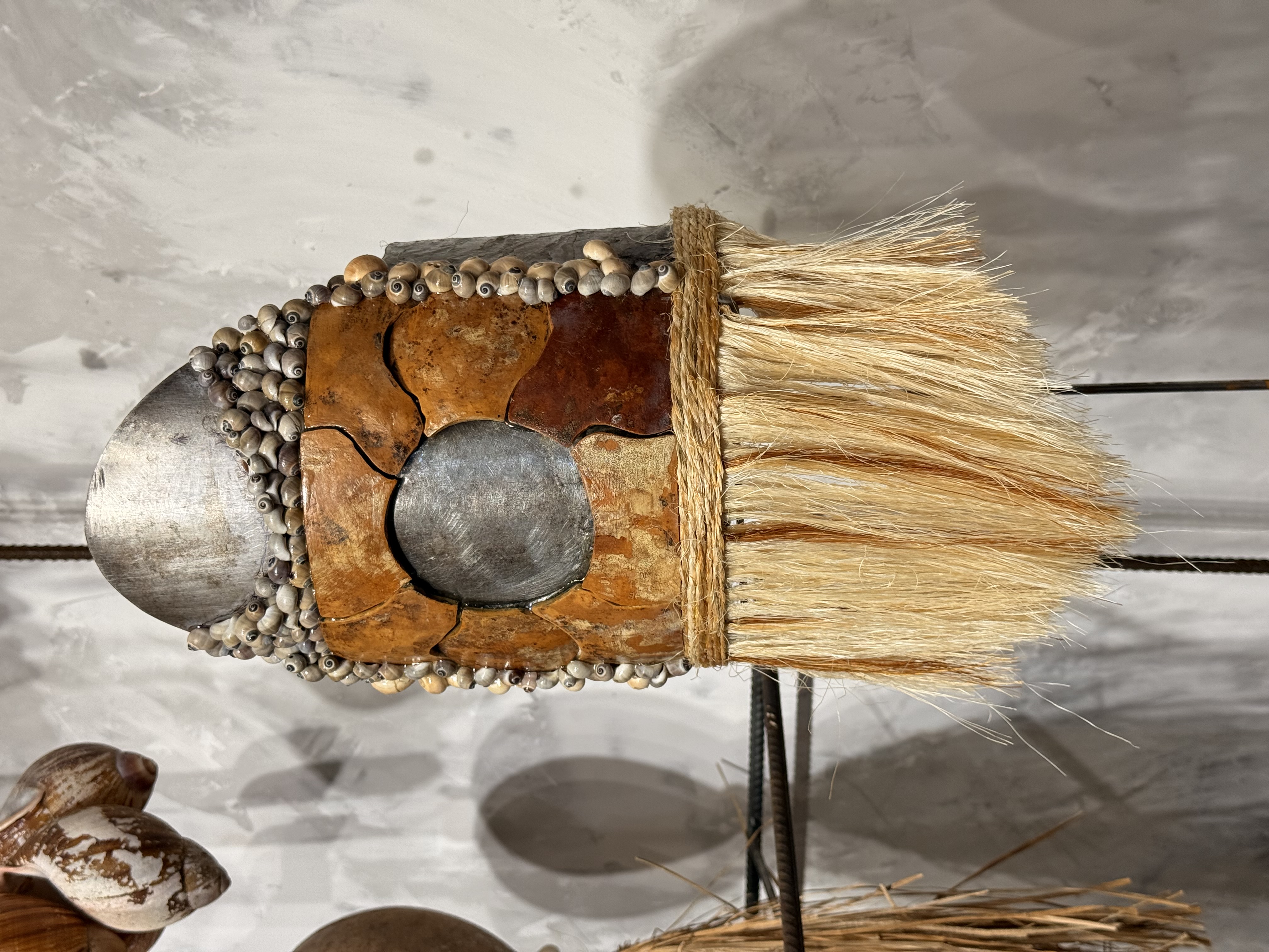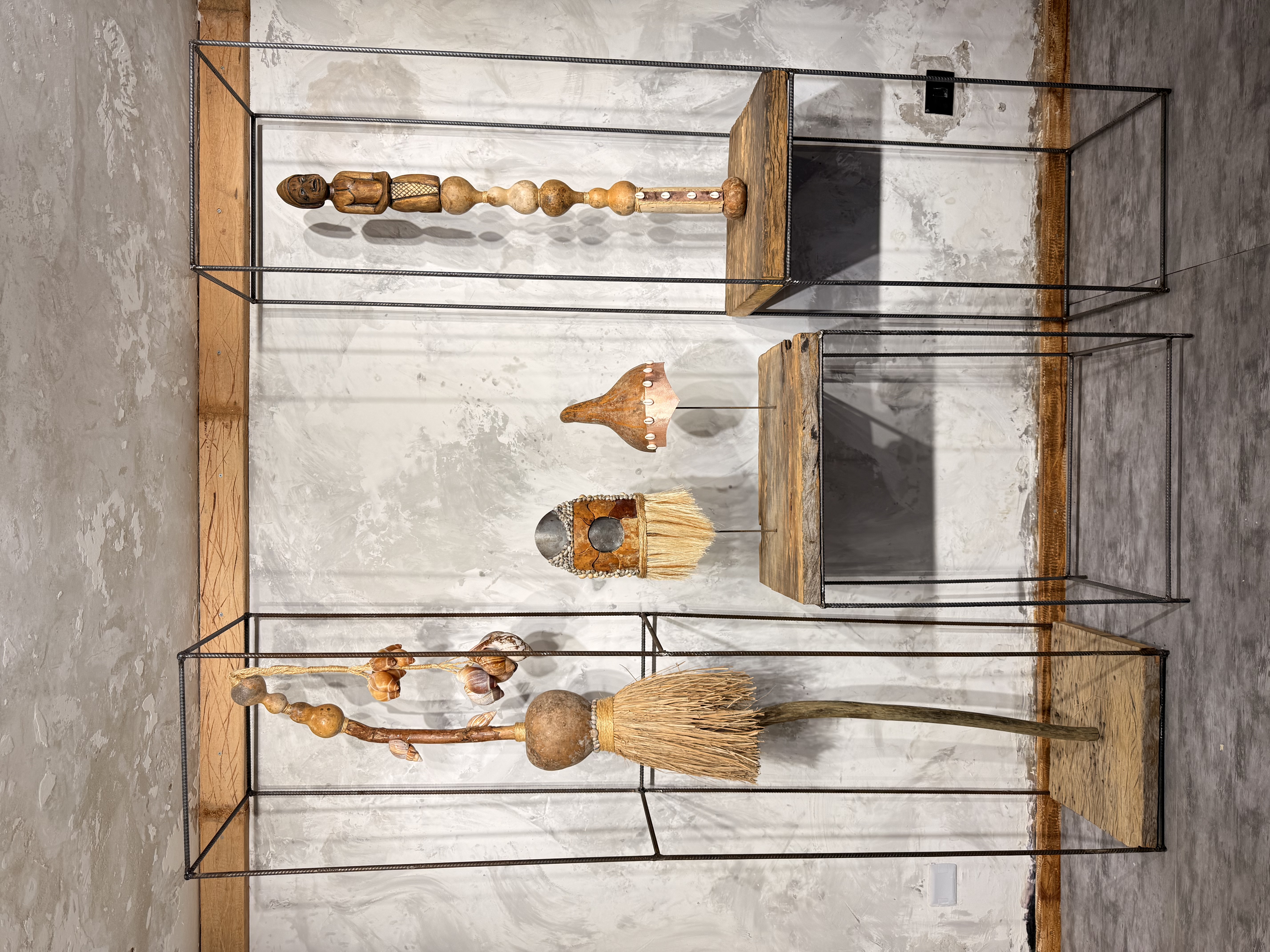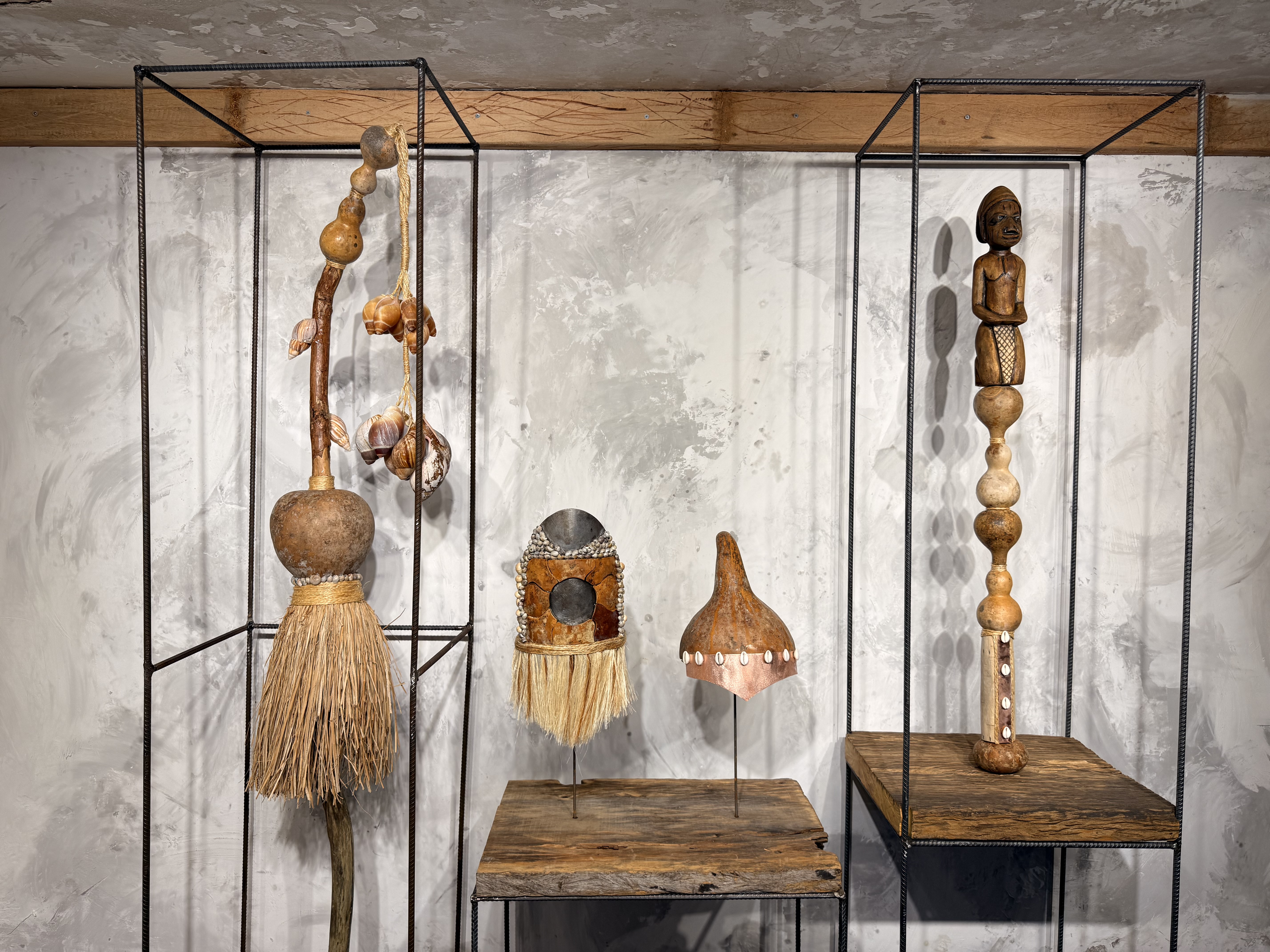 Da união dos dois, vem a matéria: cabaça, cobre, búzio, sisal cru e madeira nobre. Não são enfeites; são sentido. A instalação foi pensada em eixo: os Adês, no centro, falam como duas vozes que se olham; o Opaxorô (esq.) e o Ogó (dir.) erguem o corpo da obra. A cabaça aparece em base, forma, fragmento e encaixe — contando, por etapas, a mesma história.