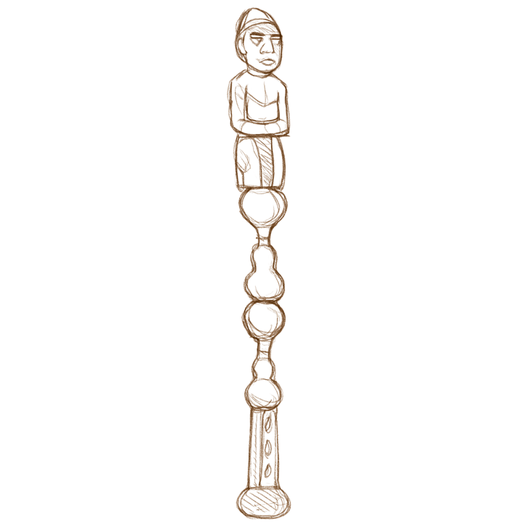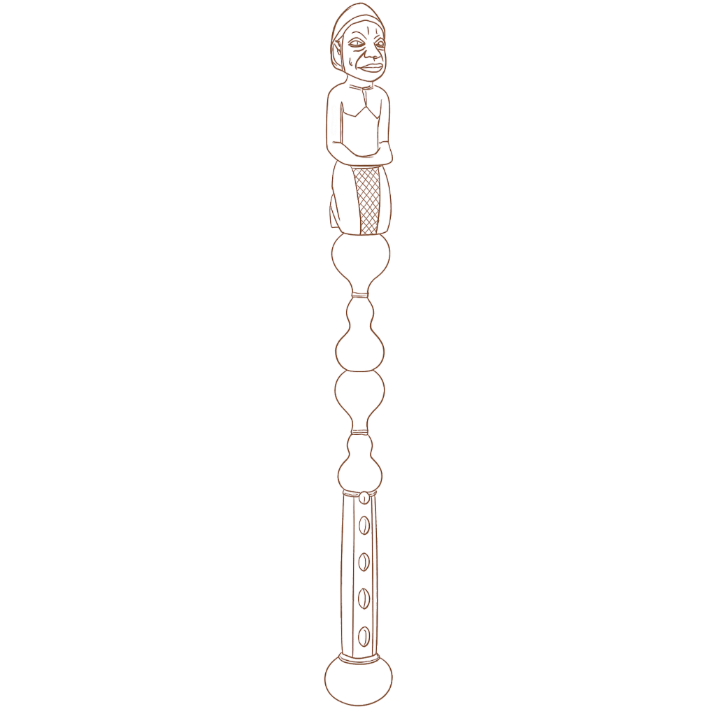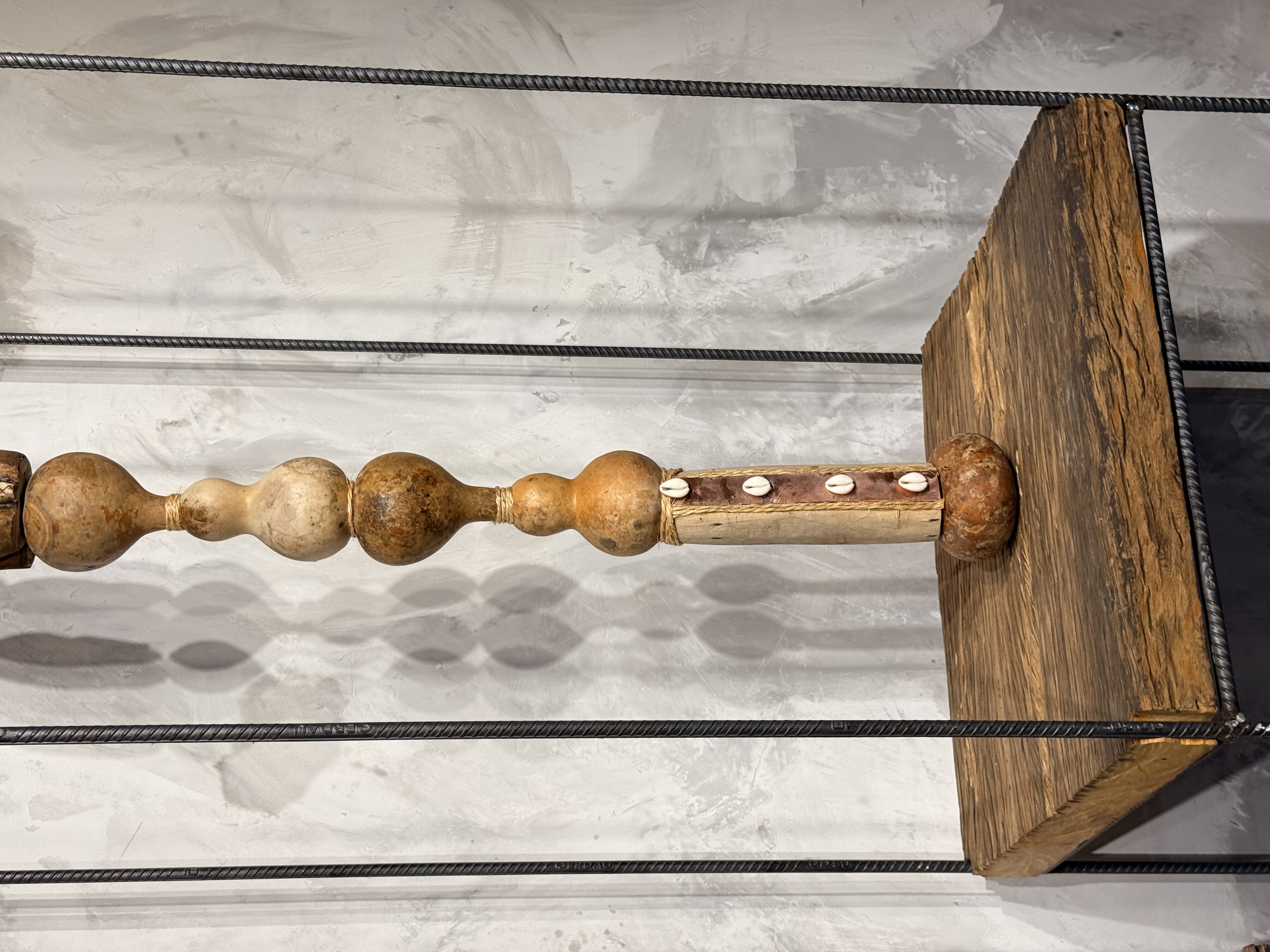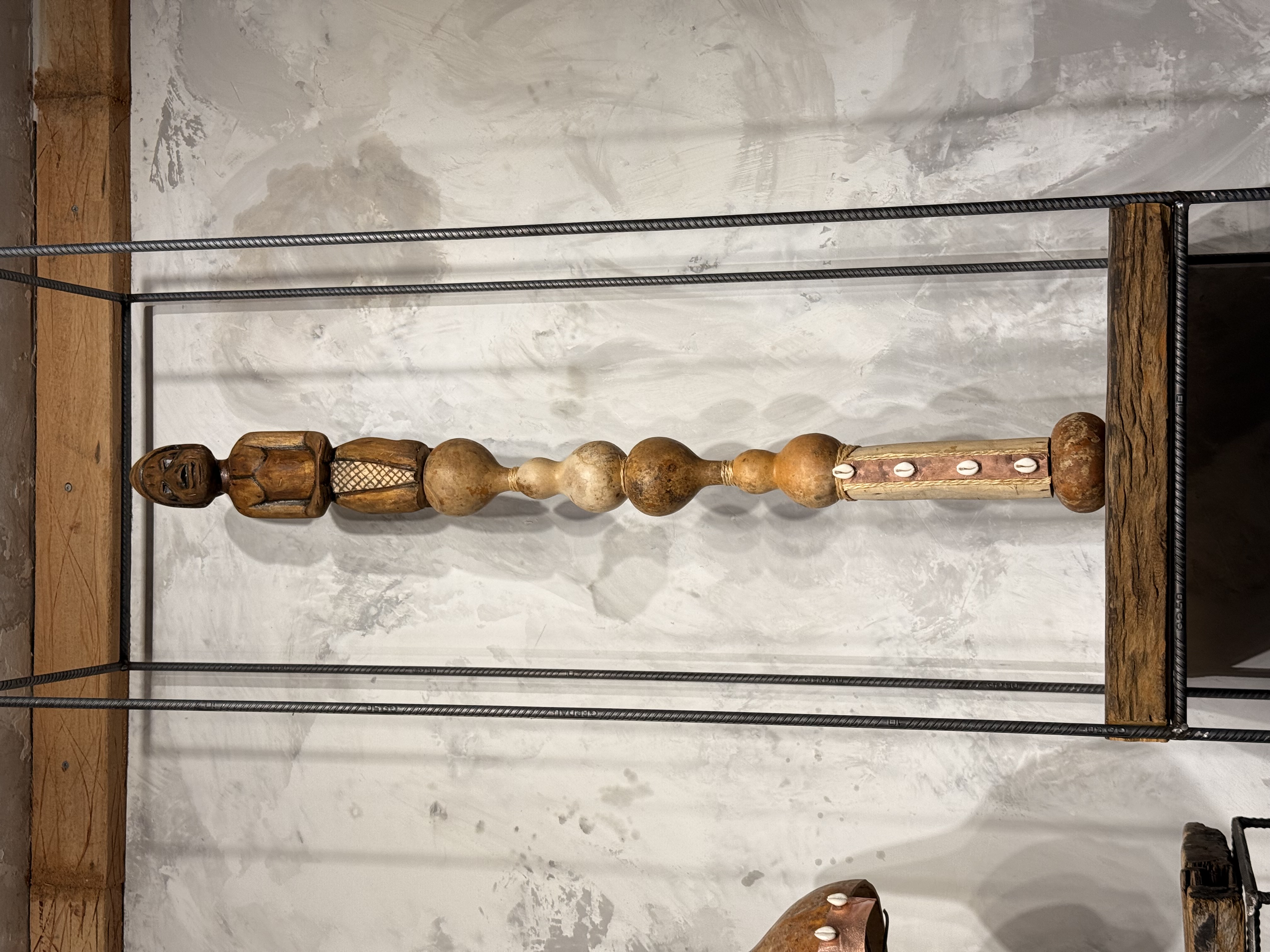 Ogó de procedência africana, com madeira clareada para harmonia geral. Foi dividido em duas artes para ajuste de massa e repousa em cinco cabaças com seleção de diâmetros. A “fatia” de cobra conversa com o cobre do Adê de Exu, criando linha de energia que liga base e coroa. O sisal aparece apenas neutro — quizila de Oxalá preservada.