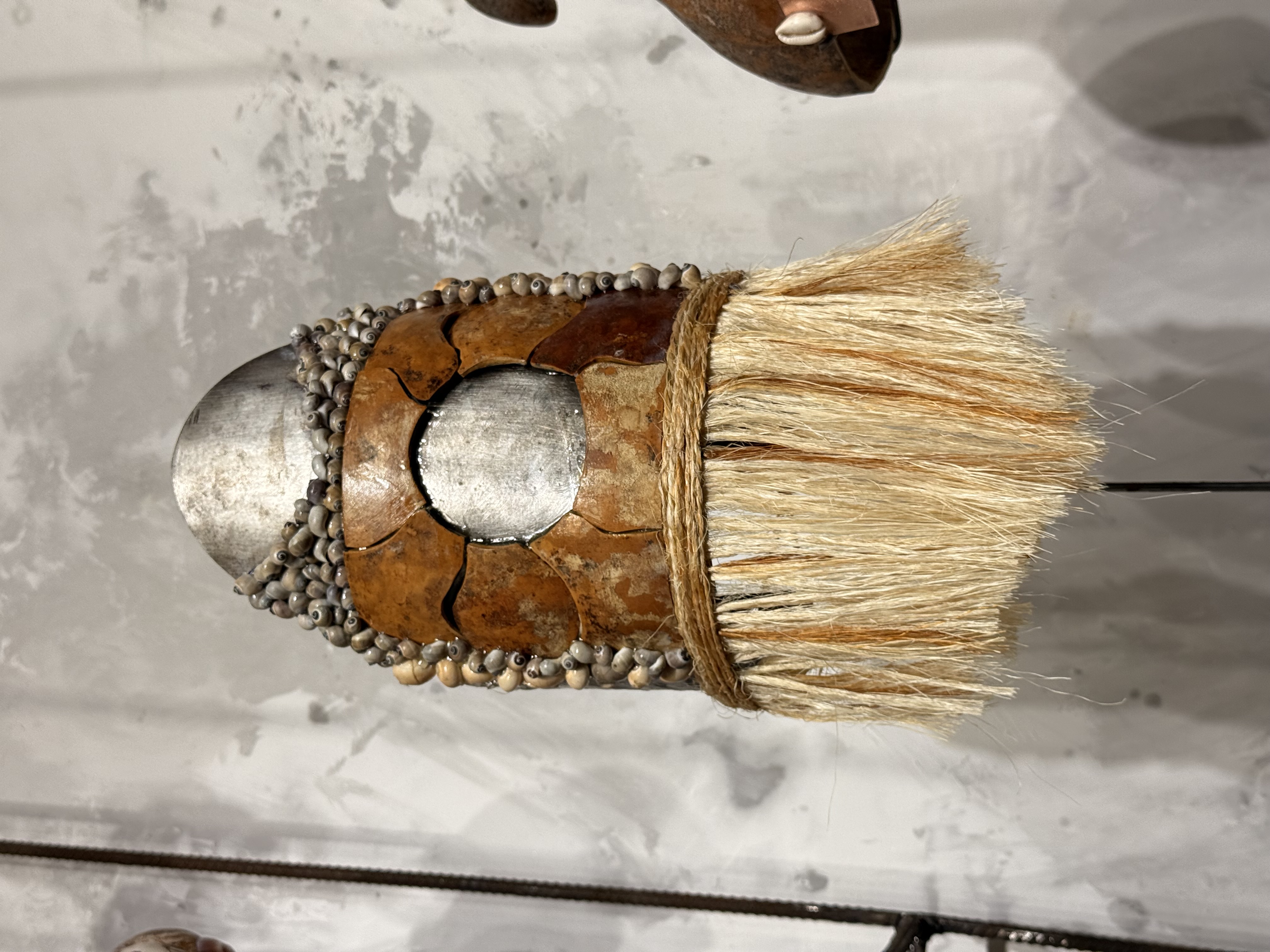 O Opaxorô assume curvatura de reverência e sabedoria. Dois cascos de igbìn dão sensação de marcha; dois cabos unidos falam do par Oxalá–Odudua. O chocalho ritual (16 cascos) traz a vibração de Oxaguiã e dá ritmo à leitura. Sustentações em cabaça reforçam estrutura e linguagem. Ao centro, uma cabaça palhada propõe a ideia de “Adê dentro do Adê”.