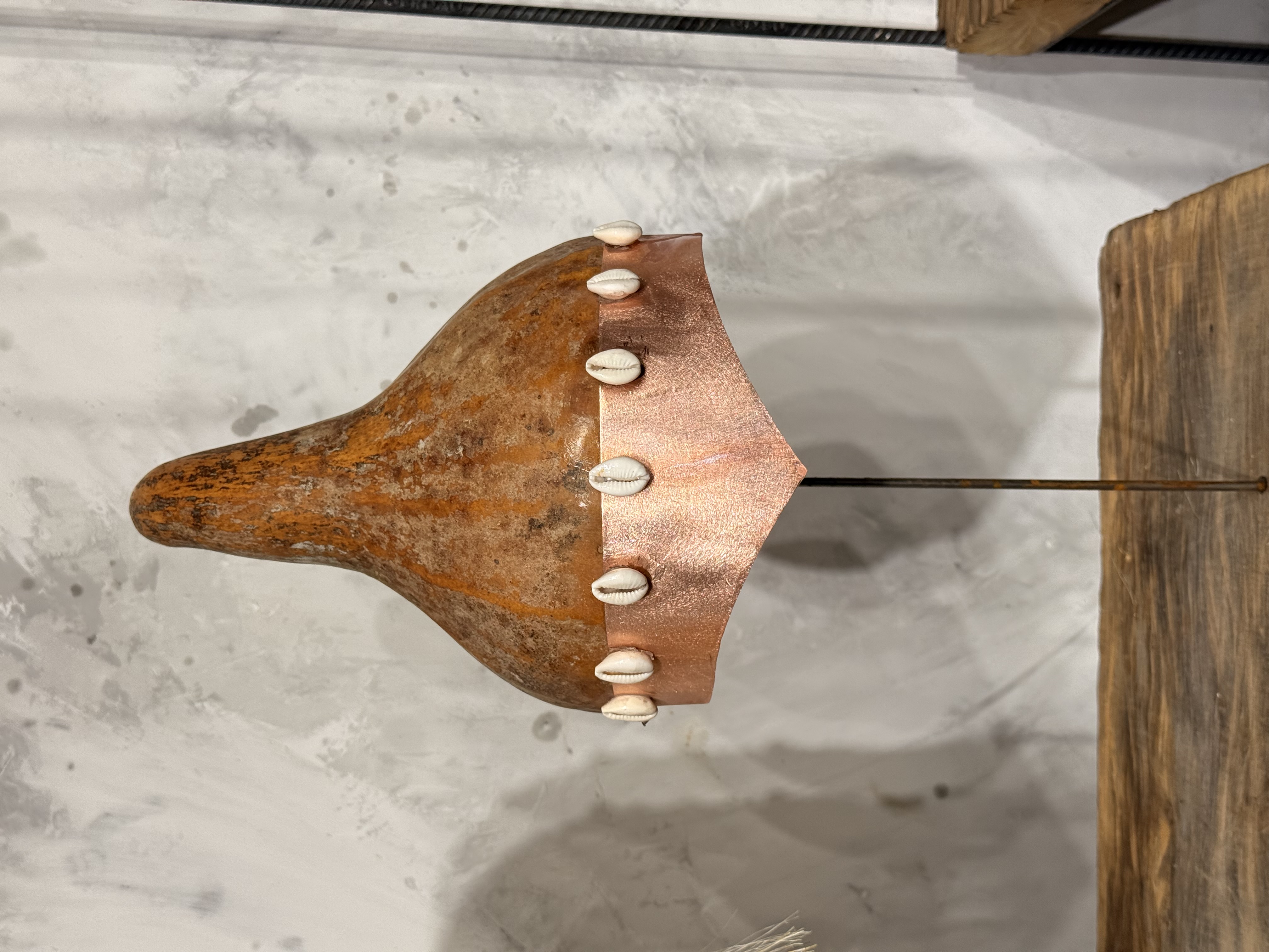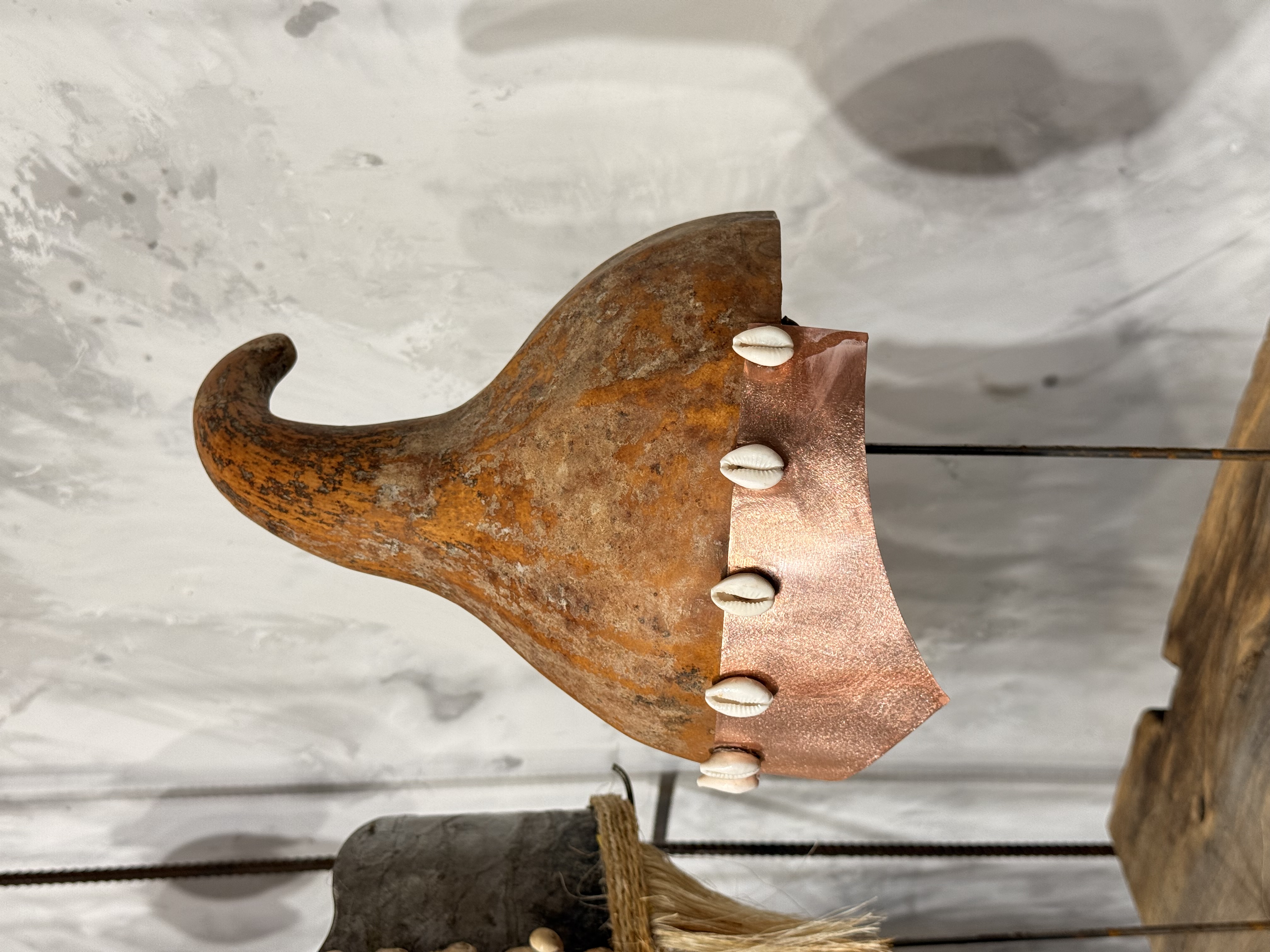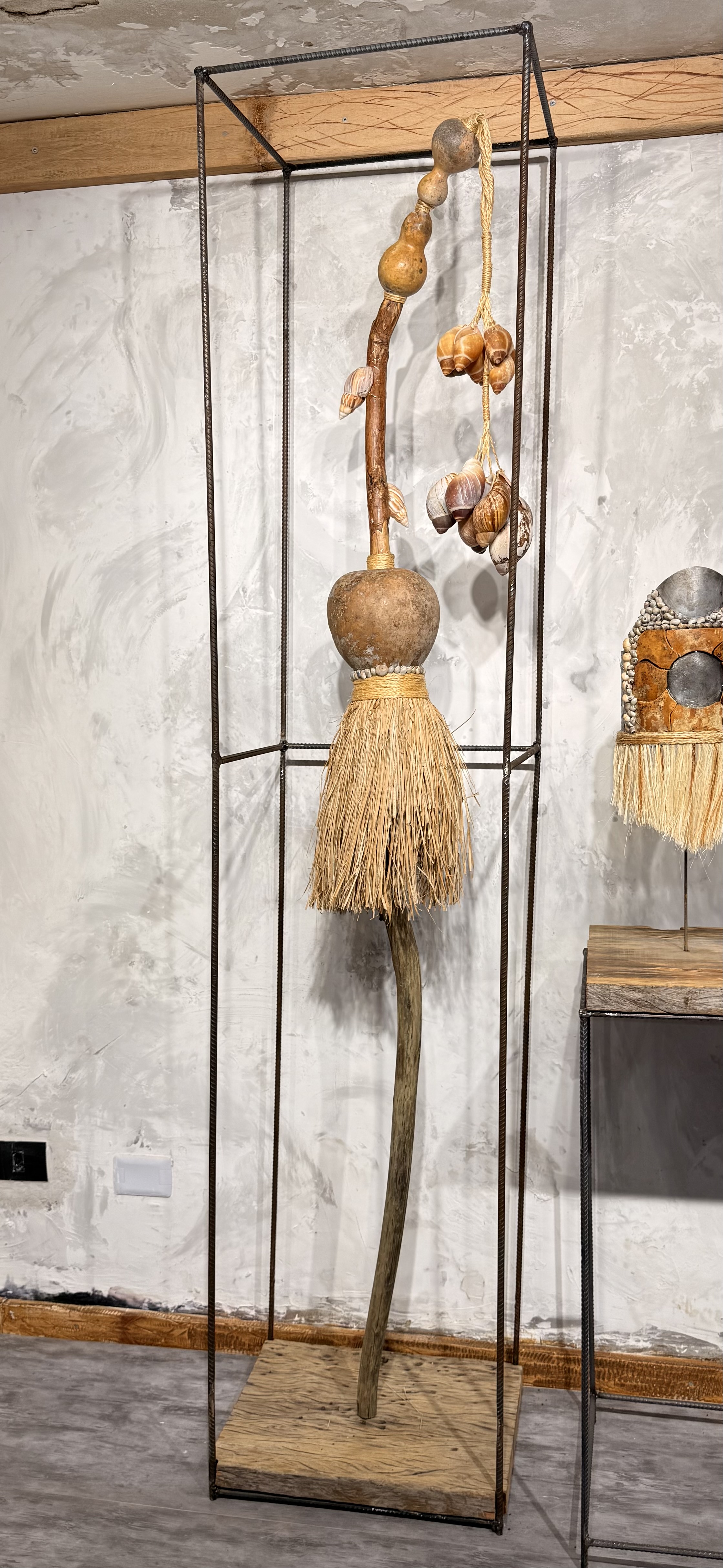 Este conjunto não busca o efeito fácil; ele assume a responsabilidade de ser fundamento tornado forma. A escolha de cada material carrega uma oração: cabaça (vida/ventre/origem), cobre (passagem/vigilância), búzio (destino/escuta), sisal cru (terra/neutralidade), madeira nobre (permanência/ancestralidade). Ao acolher esta obra, você passa a conviver com um eixo simbólico que respeita rito, tempo e memória — e que sustenta presença silenciosa no cotidiano.