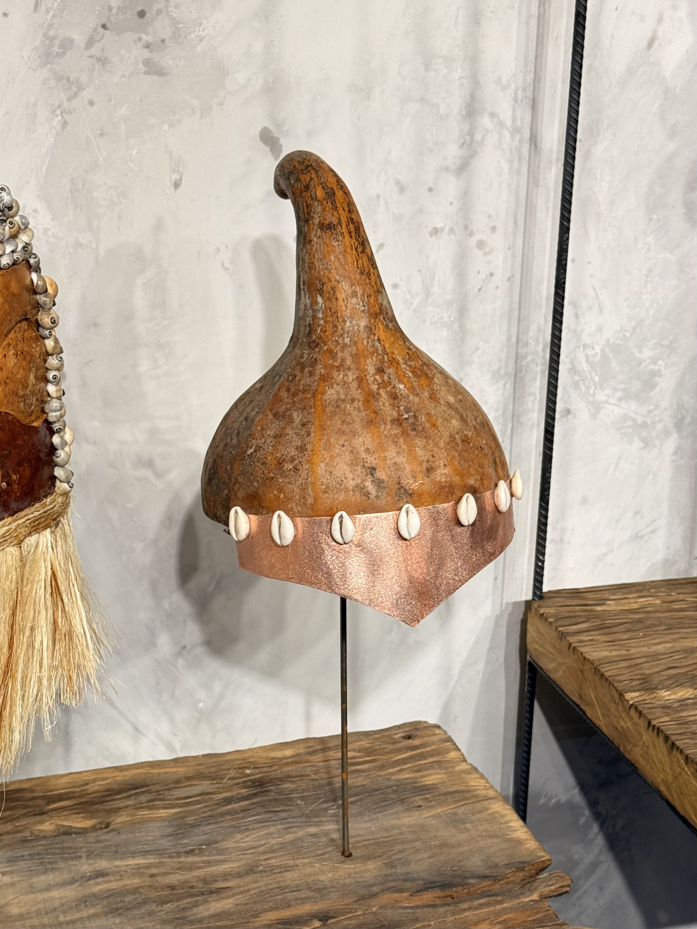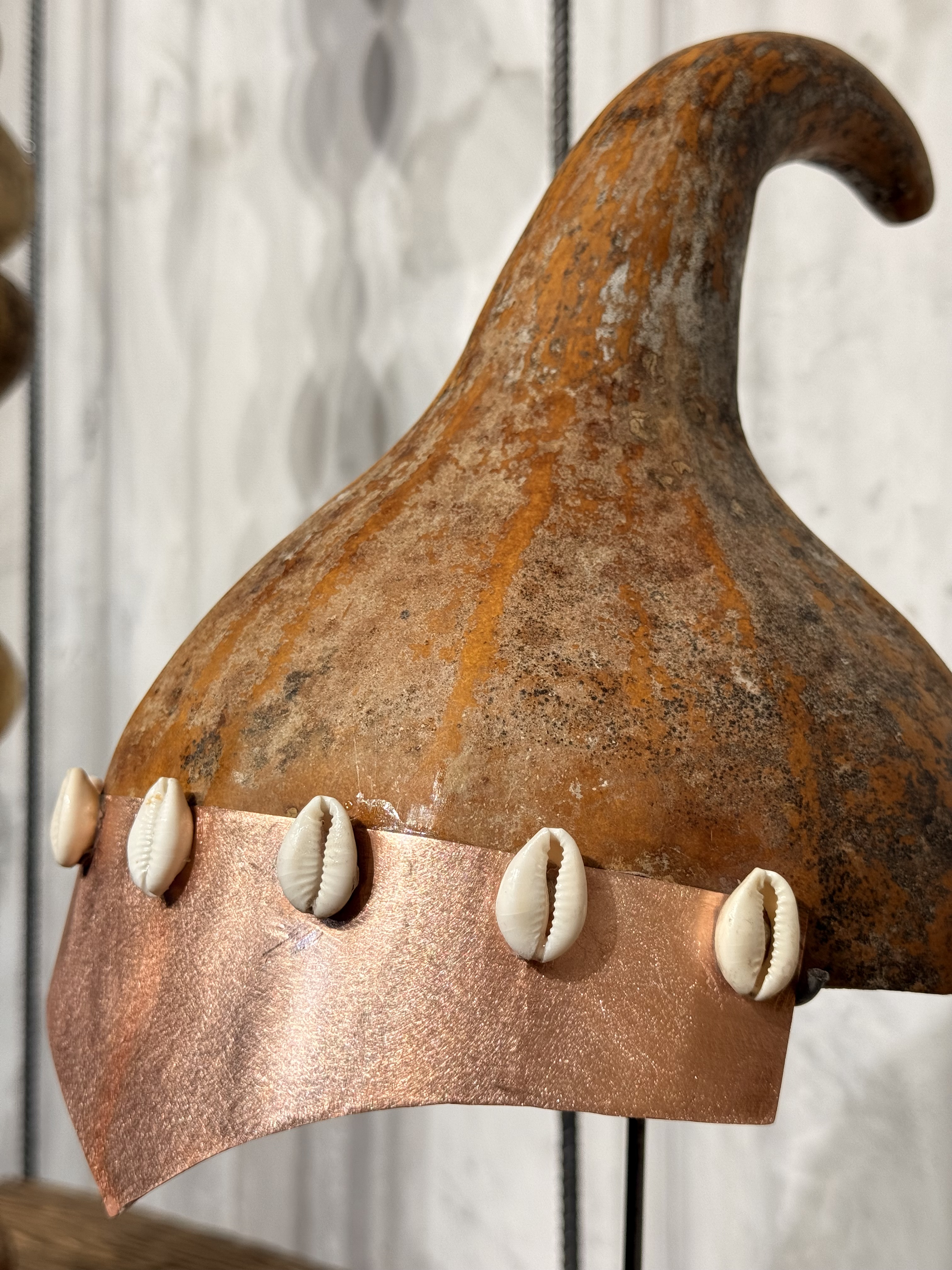 Complementar ao de Oxalufã: base em cabaça inteira (integridade), cobre cortado geometricamente (passagem, vigilância), sete búzios brancos (fundamento do Odu). A estética é de simplicidade sóbria: sem excesso de massa, com clareza de contorno e pontos de brilho contidos no cobre.